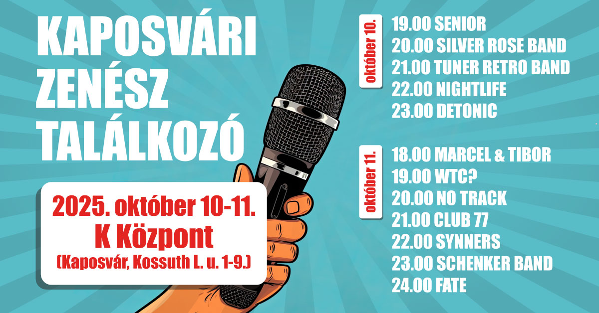 Időpont: 2025. október 10-11.,helyszín: K Központ (Kaposvár, Kossuth L. u. 1-9.) Fellépők:október 10. 19.00 Senior 20.00 Silver Rose Band 21.00 Tuner Retro Band 22.00 NightLife 23.00 Detonic október 11. 18.00 Marcel & ...