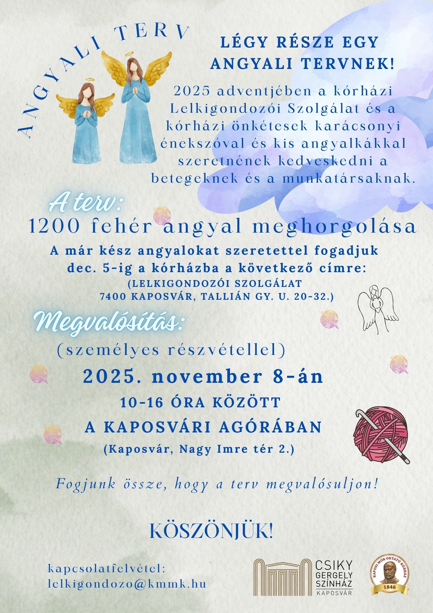 2025 adventjében a kórházi Lelkigondozói Szolgálat és a kórházi önkéntesek karácsonyi énekszóval és kis angyalkákkal szeretnének kedveskedni a betegeknek és a munkatársaknak.